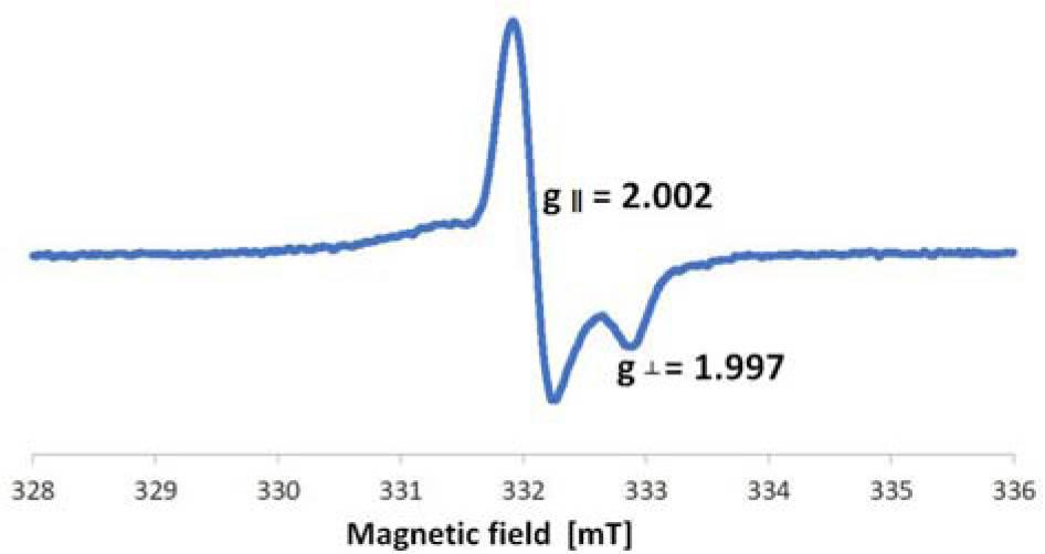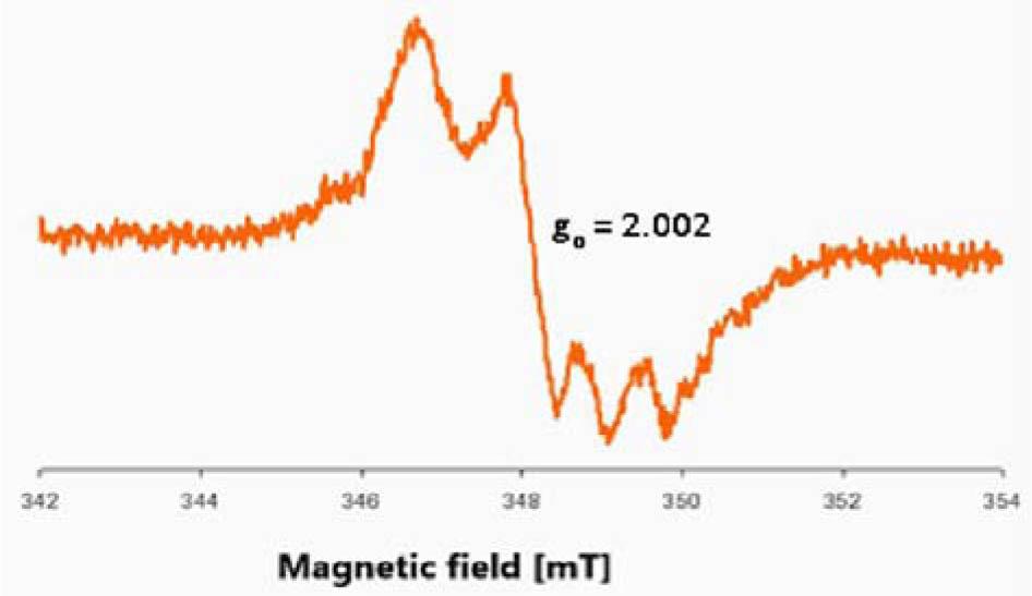 On contrary, the EPR signal in irradiated bones (Fig. 3) is exceptionally stable. It is an anisotropic singlet with g|| = 2.002 and g⊥ = 1.997 derived from a radical anion trapped in a crystalline network of hydroxyapatite – the major mineral constituent of bone tissues. Its stability makes it possible to use bone samples as radiation dosimeters [13, 22, 24] and as paramagnetic labels for dating of human remains [23, 27]. For identification of irradiated meat containing bones, the EPR spectroscopy is the first method of choice.
