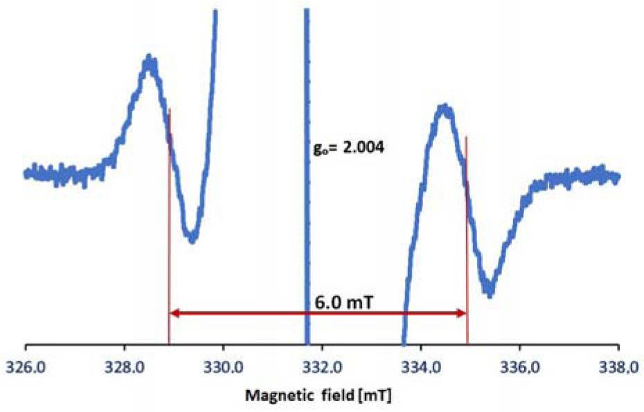EPR signal of irradiated sample of matured hazel-nut shells harvested in Polish farms. Two satellite lines of isotropic triplets distanced by 6.0 mT assigned to cellulose radical are considered the evidence of radiation treatment. The central line of the cellulose triplet is superimposed by a strong native singlet and overgrows the frames of the figure.