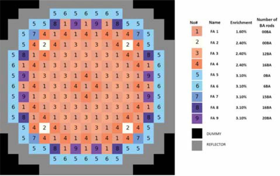 In this work, the 1000 MWe PWR defined in MIT BEAVRS benchmark was applied [11]. The first fuel cycle core design is presented in Fig. 2, and we limited the choice of fuel assemblies to nine types which were present during this cycle. It covers fuel assemblies with enrichment of 1.6%, 2.4%, and 3.1% and the number of BA rods per assembly equals 0, 6, 12, 15, 16 or 20. BAs, made of borosilicate glass, are placed in control rods guide tubes in assemblies without control rods. Neutronic calculations were performed with the PARCS core simulator [13, 14]. The model, validation, and test details are described in [15], and core definition and detailed design are available in benchmark definition document [11].