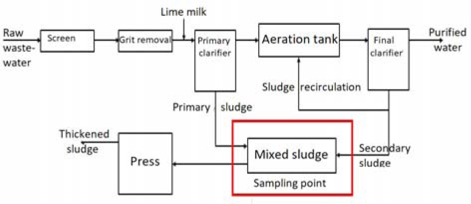 Schematic of the SEP WWTP and the sampling location (marked in red).