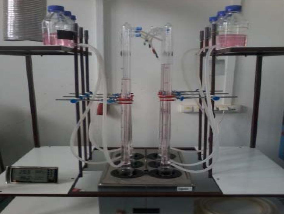 DIN 38414/8 eudiometers used for small-scale (400 ml) experiments including water bath, Testo 622 instrument for temperature and atmospheric pressure measurements table specially designed for this purpose.