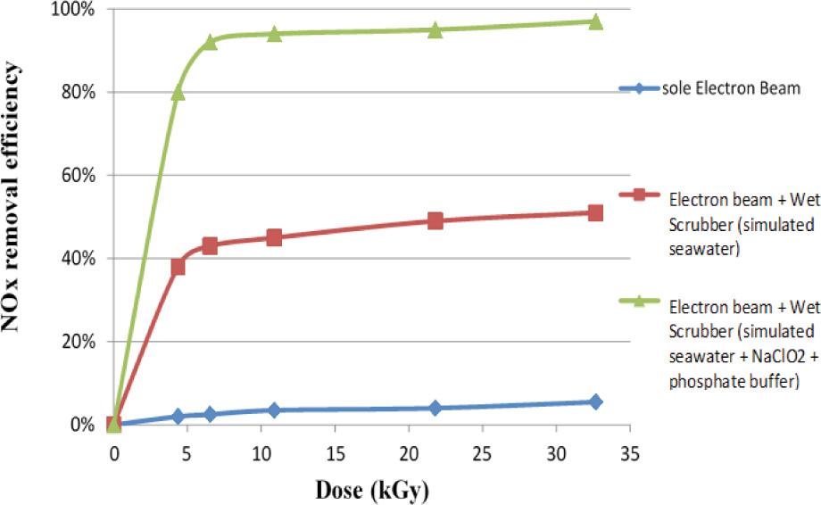 The first stage of the research on hybrid electron beam technology was conducted in the laboratory of the INCT in batch mode; 5 Nm3/h of flue gas was irradiated, while 100 l/h was bypassed to the wet scrubber for 15 min. Inlet NOx concentration was 1500 ppm. During this research, several scrubbing solutions such as 3.5% sodium chloride (simulated seawater), sodium hydroxide solution or simulated seawater with oxidant addition were applied. The highest efficiency of NOx removal (89.6%) was obtained in combined electron beam – wet scrubbing process where simulated seawater and NaClO2 with phosphate buffer were applied to perform the function of scrubbing solution [9]. A comparison of process efficiencies between method of sole electron beam and a hybrid technology, coupling electron beam with a wet scrubber in two cases – with simulated seawater and with simulated seawater and NaClO2 addition with phosphate buffer – is presented in Fig. 2.