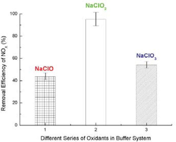 As the application of oxidants results in remarkable increase of NOx removal efficiency in hybrid EBFGT process, several oxidants (NaClO, NaClO2 and NaClO3) were examined. The most promising results were achieved when sodium chlorite (NaClO2) buffered with phosphate buffer (Na2HPO4–KH2PO4) was applied [10]. The results of the research are presented in Fig. 3.