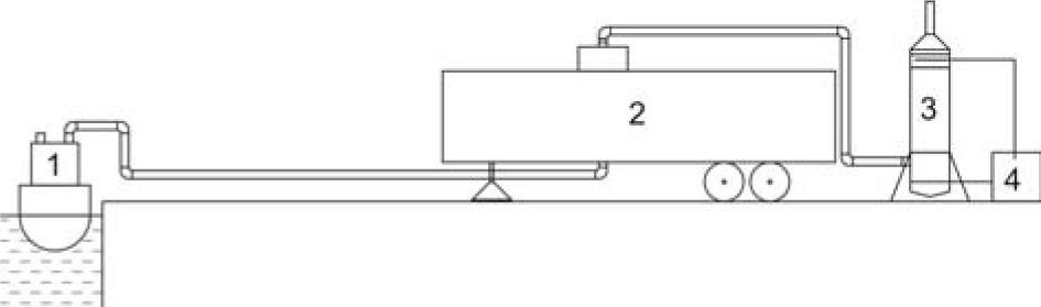 General scheme of pilot hybrid EBFGT plant. 1 – flue gas source, 2 – mobile accelerator, 3 – scrubber, 4 – seawater tank.