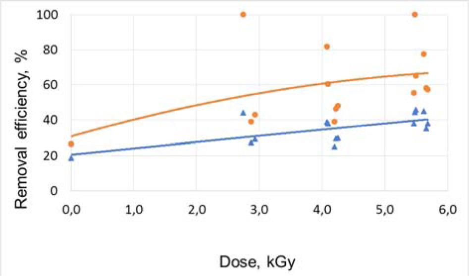 The measured NOx removal efficiencies were in good correlation with previously obtained results; however, maximal NOx removal rates did not exceed 45% (Fig. 8). Observed low NOx removal rates may be explained by the low doses applied, and they are caused by disrupted functionality of the accelerator system mounted on the both opposite sides of process vessel. One accelerator operation resulted in the fact that only half of the possible dose was available and dose distribution was not uniform due to low penetration range electrons (electron energy was 125 keV). Part of the gas stream flowing opposite to the operated accelerator window received a low absorbed dose. As NO oxidation and further absorption strongly depends on the absorbed dose, such a situation leads to decrease of overall NOx removal rates.