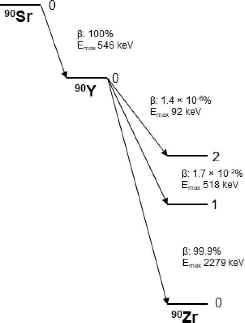The main sources of radiochemical contamination are nuclear weapon tests [1] and accidents at nuclear power plants (e.g., Chernobyl in 1986) [2]. It is worth noting that the accident at the Fukushima Daiichi power plant released very low levels of 90Sr [3]. The radioisotopes released in such accidents enter the biosphere and food chain, ultimately reaching humans. Among many fission products, 90Sr is considered to be long-lived (half-life = 28.8 years [4]) and has high radiotoxicity because of the released β radiation. The maximum radiation energies and transition probabilities of 90Sr and 90Y decay are shown in Fig. 1.
