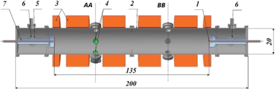 A schematic image of the experimental MAKET facility. 1 – Cathode; 2 – the vacuum chamber (anode); 3 – the magnetic system; 4 – horn antennas; 5, 7 – insulators; 6 – the vacuum-pumping system; AA, BB – sections of diagnostic ports. (The dimensions in the figure are in cm).