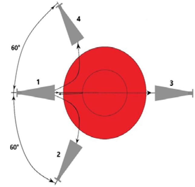 The arrangement of the horn antennas in the experimental installation. 1 – Receiving and transmitting antenna, 2 – receiving lower antenna, 3 – receiving antenna, 4 – receiving upper antenna.