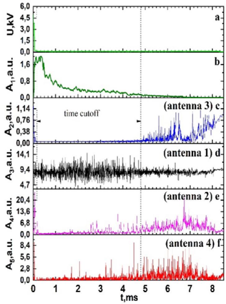 Time evolution of discharge voltage (a), plasma optical emission intensity (b), (c–f) – amplitudes of detected microwave signals received by antennas 3, 1, 2, and 4 (see Fig. 3) respectively.