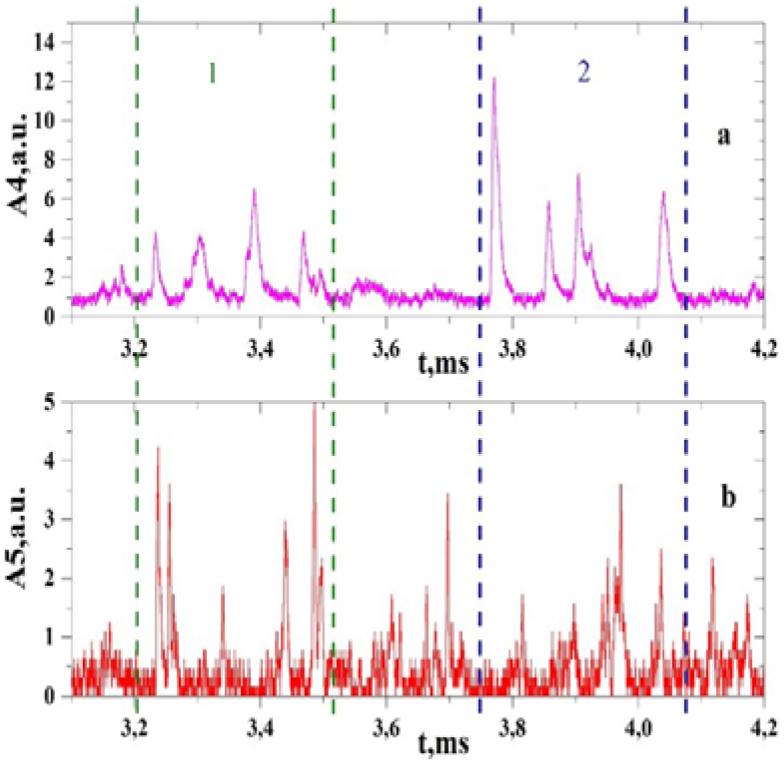 In the time interval from 1.5 ms to 4.7 ms, (see Figs. 4e and 4f), we can see the increase in the amplitude of reflected signals received at angles of 60° relative to the antenna 1. The signals on the shifted horn antennas 2 and 4 are related to reflection from the plasma layer and refraction. These signals carry information about the inhomogeneities of the rotating plasma. The reflected signals at angles of 60° starting from 4.7 ms on the one hand are caused by the scattering of microwaves on plasma fluctuations and, on the other hand, by possible reflection from the wall of the discharge chamber.