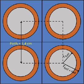 The geometry of the fuel cell used in the analyzed PWR is square, as shown in Fig. 1, with a pitch diameter of 1.4 cm, a cladding thickness of 0.057 cm, and a 60% fuel volume fraction. The fuel used is Th-233U, with the types of dioxide, carbide, and nitride. Two types of cladding are used in this study, namely zircaloy-4 and ZIRLO (Zr low oxygen). Both are cladding zirconium-based alloys commonly used in PWR, with almost the same composition, but ZIRLO exhibits superior mechanical properties and enhanced corrosion resistance compared to zircaloy-4 [25]. The height and diameter of the PWR under analysis are 240.8 cm and 224.0 cm, respectively, and it has three different power levels: 300 MWth, 400 MWth, and 500 MWth. These power levels have power densities of 31.63 W/cc, 42.17 W/cc, and 52.72 W/cc, respectively. When compared to the average core power density of the conventional PWR AP1000 (109.7 W/cc) [26], each of these power levels represents approximately 28.83%, 38.44%, and 48.06% of the AP1000’s power density. This reactor’s design uses lower power levels to enable extended reactor operation.