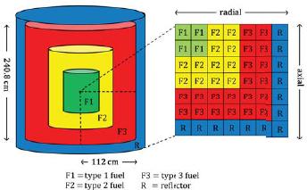 The reflector is made of stainless steel and water, and it has a 22.4 cm thickness. The reactor core has three fuel regions (F1, F2, and F3) with a 1%233U content difference between each fuel region. F1 is the fuel region with the least fissile material, F2 is the fuel region with the medium fissile material, and F3 is the fuel region with the most fissile material [27]. The analyzed PWR design parameters are shown in Table 1. For the reactor core calculations in this study, a two-dimensional R–Z geometry is used, divided into three radial and axial fuel regions with different 233U enrichments, as shown in Fig. 2. In the radial direction, F1 and F2 each have a radius of 39.2 cm, while F3 has a radius of 33.6 cm. In the axial direction, F1 has a radius of 42 cm, while F2 and F3 each have a radius of 39.2 cm.