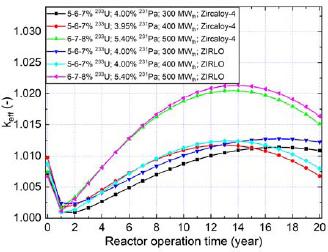 Figure 3 shows that for the (Th-233U)O2 fuel type, no fuel configuration reaches a critical condition throughout the reactor operation cycle with excess reactivity <1.00% dk/k. Both for the zircaloy-4 and the ZIRLO cladding types, the best performance is achieved with an enrichment configuration of 5–6– 7%233U at power levels of 300 MWth and 400 MWth, with excess reactivity slightly exceeding 1.00% dk/k.