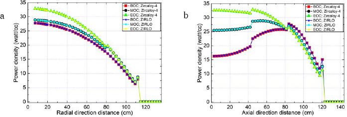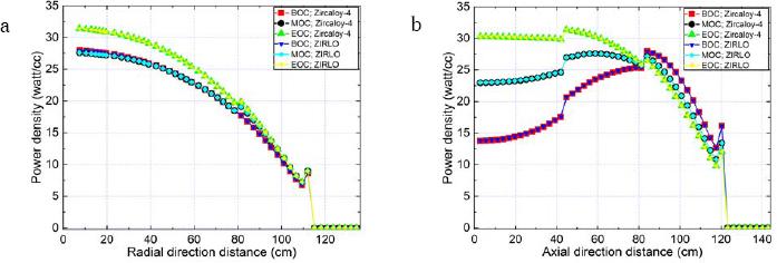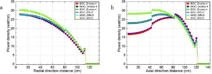 In the axial direction, as shown in Figs. 6b, 7b, and 8b, the distribution patterns for the three fuel types also exhibit similarities. In the axial direction, it can be observed that all three fuels have significant variations in power density near the axial center up to a distance of approximately 81.20 cm during BOC, MOC, and EOC.