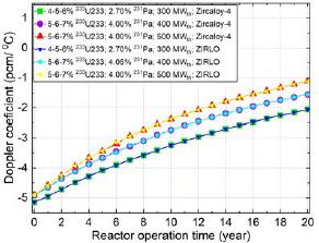 Figure 9 shows the change in the Doppler coefficient value with increasing reactor operating time for fuel (Th-233U)O2 with the best criticality level. The Doppler coefficient is relatively the same for fuels using zircaloy-4 and ZIRLO cladding. The average value of the Doppler coefficient of fuel (Th-233U)O2 with the best criticality level is –2.94 pcm/°C at 300 MWth power level, –2.77 pcm/°C at 400 MWth power level, and –2.57 pcm/°C at a power level of 500 MWth.