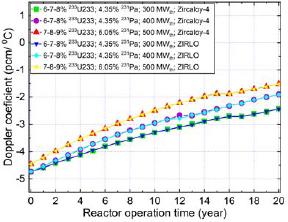 Doppler coefficient for the (Th-233U)O2 fuel with the best criticality at 300 MWth, 400 MWth, and 500 MWth with zircaloy-4 and ZIRLO cladding.