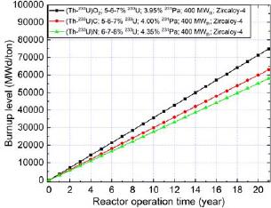 Burnup level of (Th-233U)O2, (Th-233U)C, and (Th-233U)N at 400 MWth power.