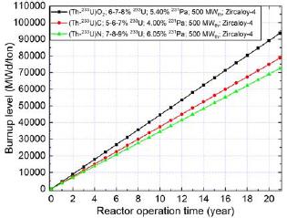 Burnup level of (Th-233U)O2, (Th-233U)C, and (Th-233U)N at 500 MWth power.