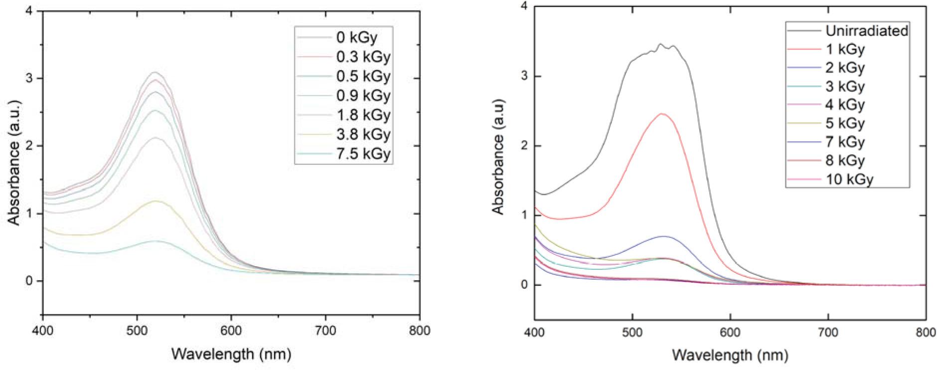 As shown in Table 1, the unirradiated solution remained stable over a 1 h time span, with a relative change in peak absorbance of <5%. The 7.5 kGy solution showed instability already at 10 min, increasing in absorbance by 5%. Minimal changes in peak absorbance of 0.5–4.3% occurred for solutions irradiated from 0.3 kGy to 3.8 kGy during the 10–30 min time interval. Although minimal, these uncertainties must be considered when evaluating dosimetric data, even when the readout is done directly after irradiation.