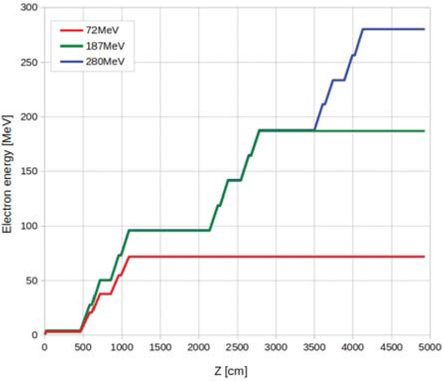 Planned electron beam energy dependence as a function of Z coordinate, along a superconducting linear PolFEL accelerator.