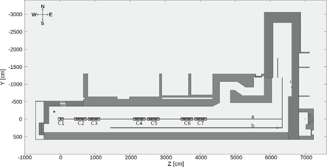 Model of a linear electron accelerator for the planned energies of 72 MeV, 187 MeV and 280 MeV, together with the planned seven superconducting accelerating cryomodules (C1–C7) required to achieve the maximum assumed electron beam energy of 280 MeV. One can see the two trajectories foreseen for the 187 MeV and 280 MeV beams (a) and for the 72 MeV beam (b). The scheme shows one of the planned versions of the shield walls, based in part on the walls of another already existing bunker. In the upper left corner, there is an indication of the world directions in relation to which the planned bunker will be oriented.