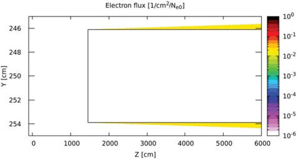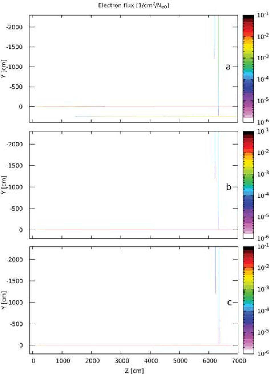Spatial distribution of electron fluxes lost from the main beam and transported in vacuum for 72 MeV (a), 187 MeV (b) and 280 MeV (c). Horizontal view, parallel to the beam axis. All Monte Carlo calculation results presented in this paper are normalized to a single primary beam electron.