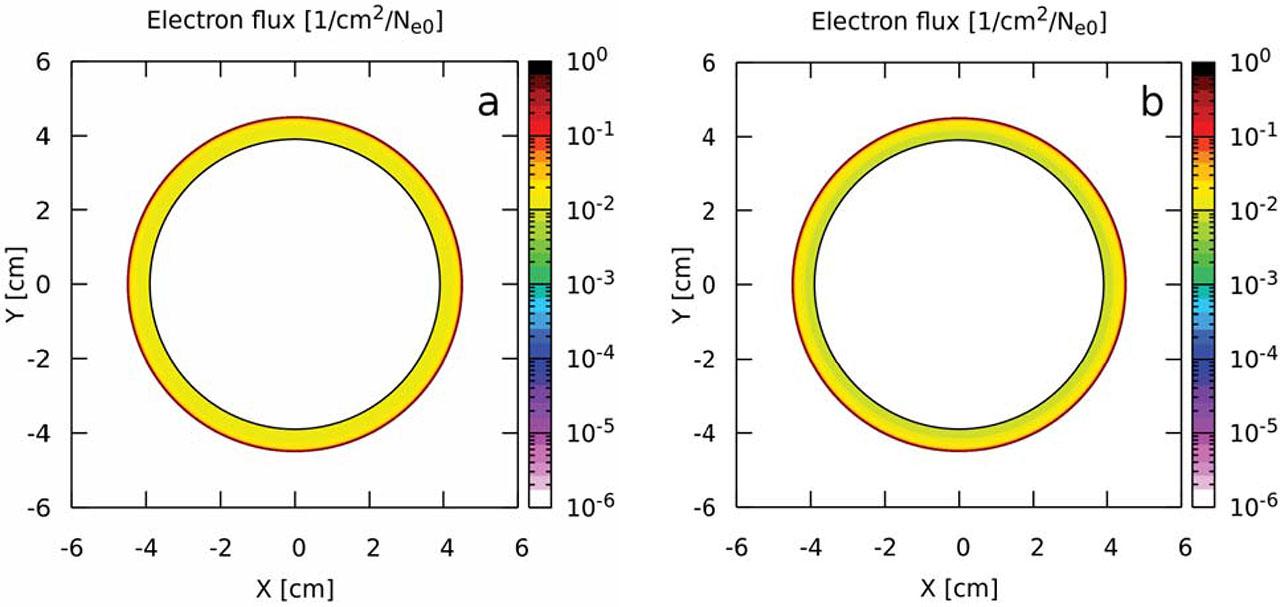 Magnification of the spatial distribution of electron flux for 72 MeV, (a) for the main beam pipe and (b) for the beam pipe shifted by 2.5 m. The limits of a cylinder of radius 3.9 cm are visible. View in the plane perpendicular to the beam axis for Z coordinate = 62 m.