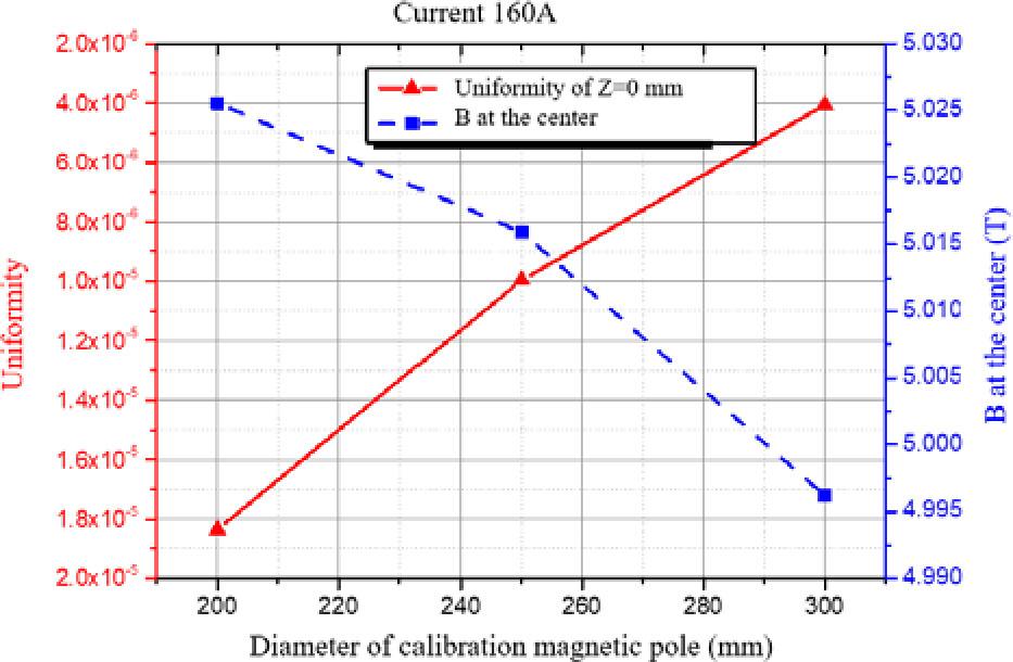 It is preliminarily determined to adopt cylindrical magnetic poles with diameters of 200 mm, 250 mm, and 300 mm respectively. The Tosca software is used to simulate the magnetic induction intensity value B and the uniformity value at the center point of the calibration magnetic field. The simulation model is shown in Fig. 3, and the simulation results are shown in Fig. 4. The red solid line represents the magnetic field uniformity value of the calibration space, and the blue dotted line represents the magnetic induction intensity value B at the center point. When the energizing current of a single turn coil for the superconducting coil is 160 A, the value of magnetic induction intensity B at the center point is close to 5 T. As the diameter of the calibration magnetic pole increases, the magnetic induction intensity B at the center point decreases, while the uniformity of magnetic field in the uniform space increases.
