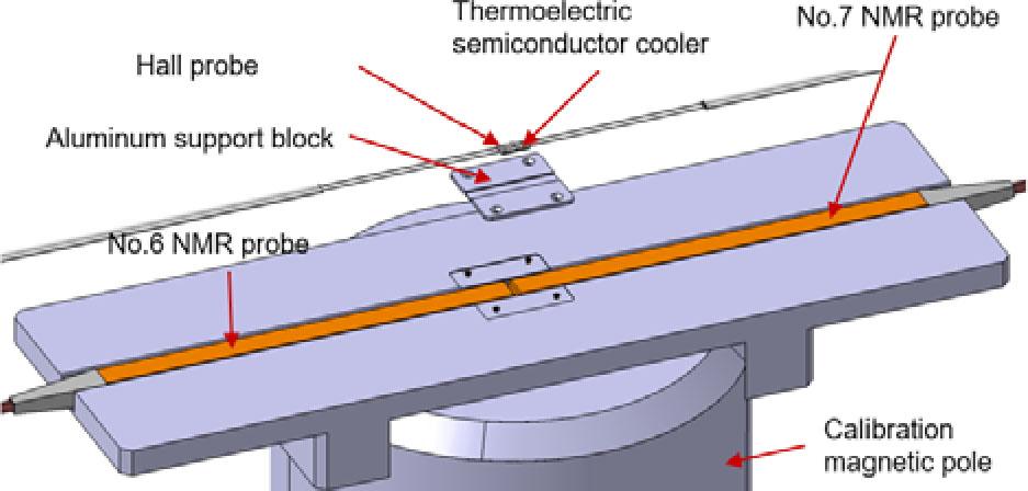 After completing the design and installation of calibration tooling, Fig. 6 shows an exploded view of the calibration tool. The slot on the tooling base plate is used to place two NMR probes no. 6 and no. 7. The Hall probe is situated in a groove on an aluminum support block and fixed by pressing it with a flat plate. The thermoelectric semiconductor cooler is pasted on the Hall probe and needs to be fully bonded to ensure uniform temperature conduction. This tooling design can ensure a close fit between the NMR and Hall probes. No. 6 and no. 7 1062 series NMR probes and 2 SENIS Hall probes are installed on the tooling fixture, respectively.