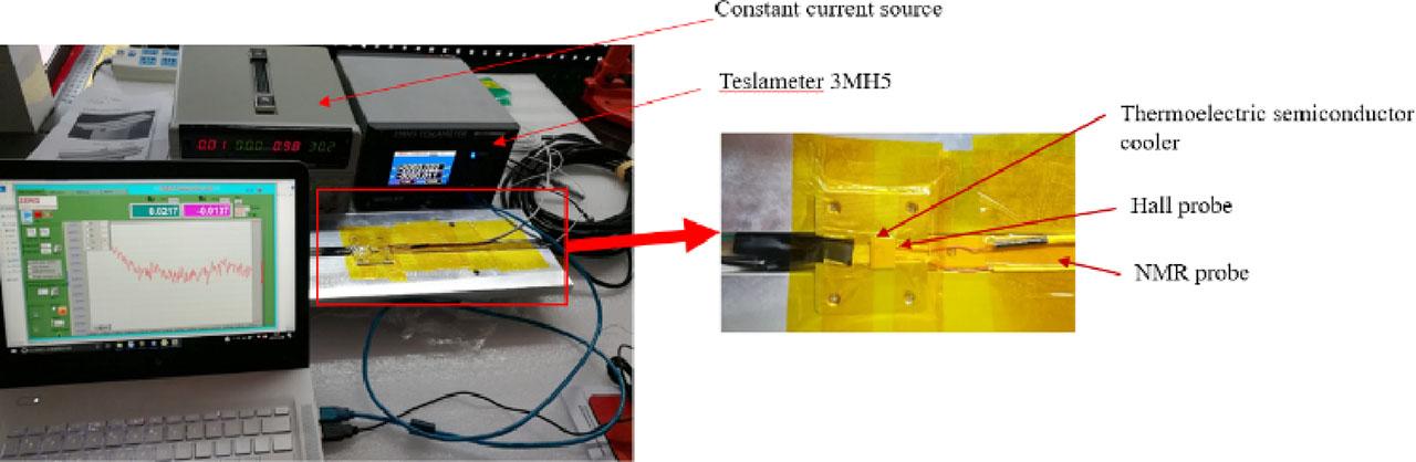 The construction of the thermoelectric semiconductor cooler temperature test-bed is shown in Fig. 9. It is mainly composed of a constant current source, SENIS-3MH5 Teslameter, calibration tooling, and a computer. In this case the NMR probe is only used as the support of Hall probe and does not need to be connected to Metrolab-PT2025.