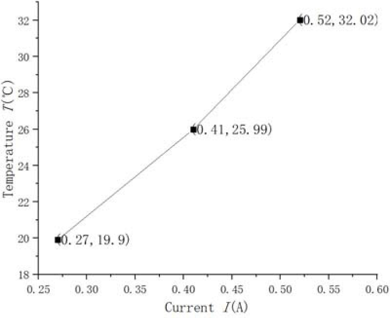 By adjusting the output current value of the constant current source, the relationship between the energizing current and the probe temperature is obtained, as shown in Fig. 10. During the temperature experiment, the temperature stability was good and no fluctuations were observed. The heating and cooling rates of the Hall probe are different. It takes 55 s for the temperature to rise from 20°C to 32°C, while it takes 40 s to drop from 32°C to 20°C.