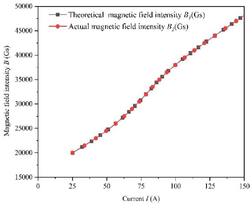 The calibration process is determined based on the calibration principle. The Hall probe, NMR probe, and thermoelectric semiconductor cooler were integrated on the calibration tooling and then placed in a homogeneous field of the accelerator. Start by connecting the cable and debug the interface. The calibration temperature is adjusted to 20°C. The initial calibration point is 2 T and the step size is 300 Gs. In addition, the step size and the number of calibration points can be adjusted based on the test results. At 20°C, the relationship between the excitation current I and the required magnetic induction intensity B is as shown in Fig. 11. For the same excitation current value I, the theoretical magnetic induction intensity is B1, and the actual magnetic induction intensity is B2. After analysis and calculation, the error between them is acceptable.