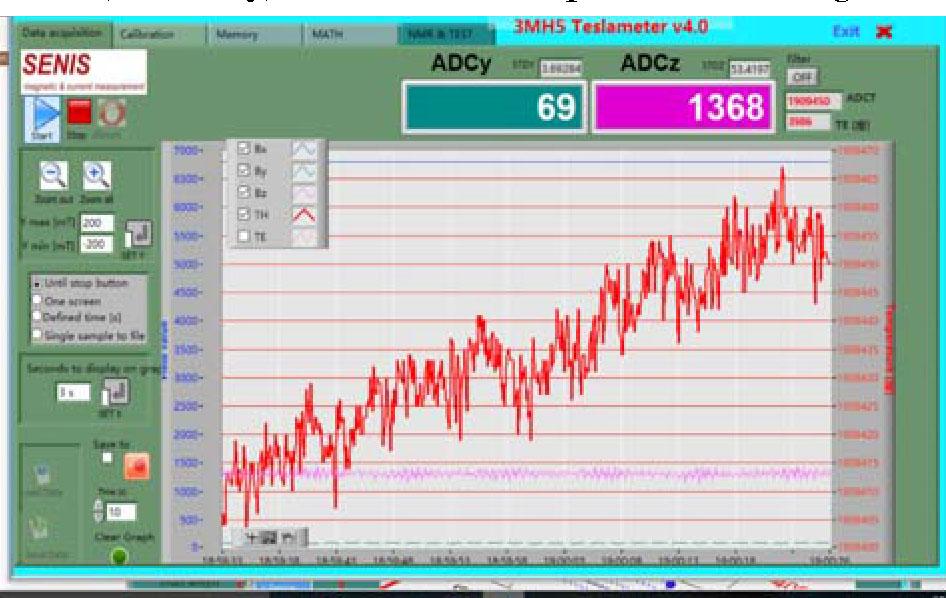 In the magnetic field calibration environment, the magnetic induction intensity values are read by the SENIS calibration software, and the curves of Bx, By, Bz, and temperature TH values are plotted in real-time, as shown in Fig. 13.