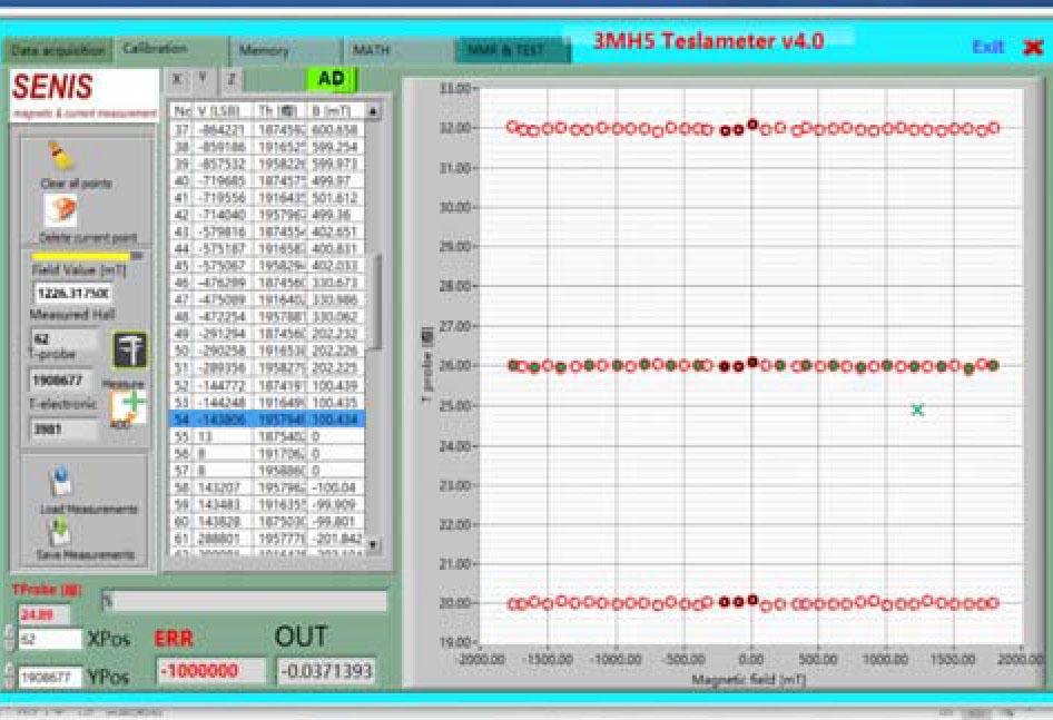 As shown in Fig. 15, after completing collection of the calibration data, the corresponding calibration factor, namely, the relationship between magnetic induction intensity B and voltage U and temperature TH, is obtained through fitting calculation using the SENIS built-in algorithm. In this way, each Hall probe corresponds to a fixed calibration factor. After resetting the device, the calibration table is refreshed by Tesla 3MH5, and the new calibration factor can directly call up. Eventually, the magnetic field could be measured through the Hall probe directly.