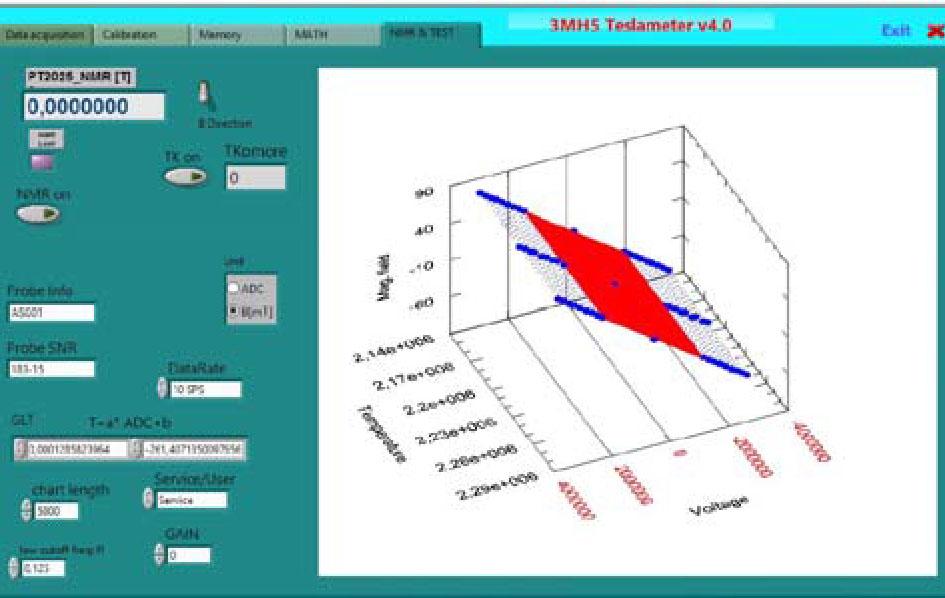 After the measurement values are stable, the signal light of the PT2025 equipment will light up. The measurement values of each calibration point are recorded through the “Measure” and “Add” buttons in the program. The PT2025 Teslameter is used to read the precise magnetic induction intensity, and the Teslameter 3MH5 is used to measure the voltage and temperature values. When the magnetic induction intensity reaches 3.2 T, the no. 7 NMR probe is connected to the PT2025 instrument.