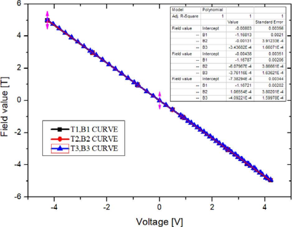To achieve the relationship of magnetic induction intensity and voltage B–U the three temperatures were calculated at T1 = 20°C, T2 = 26°C and T3 = 32°C, respectively. The B–U curve is fitted by cubic polynomial method, that is, Bpol1 = a0 + a1 × U + a2 × U2 + a3 × U3, where a0, a1, a2 and a3 are fitting curve coefficients. The curve fitting results are shown in Fig. 16 and the polynomial formula is shown in Table 2.
