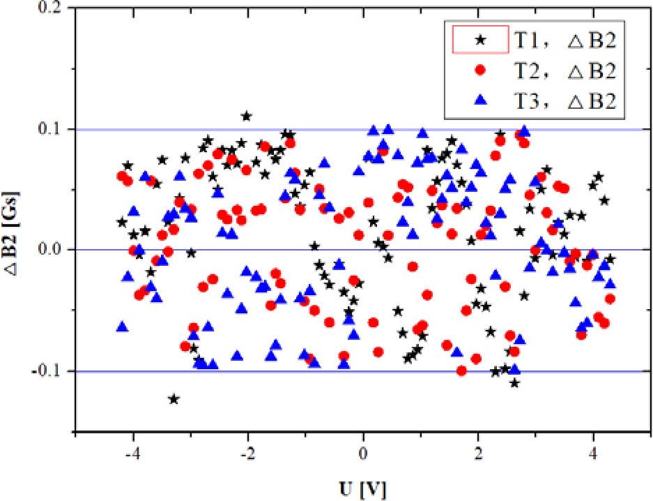 Calculate the deviation ΔB2 = B–Bpol2 and make the scatter diagram of ΔB2. The scatter diagram of ΔB2 is shown in Fig. 17. The distribution range is between −0.1 Gs and 0.1 Gs, which is less than ±1 Gs, so the B–U calibration data are acceptable.