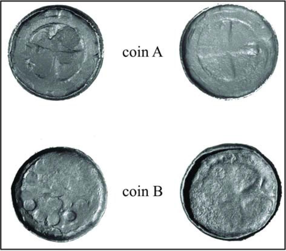 Photo of cross denars: the top image represents coin A and the bottom image represents coin B. In both cases, there is the obverse on the left side of the figure, and the reverse on the right side.