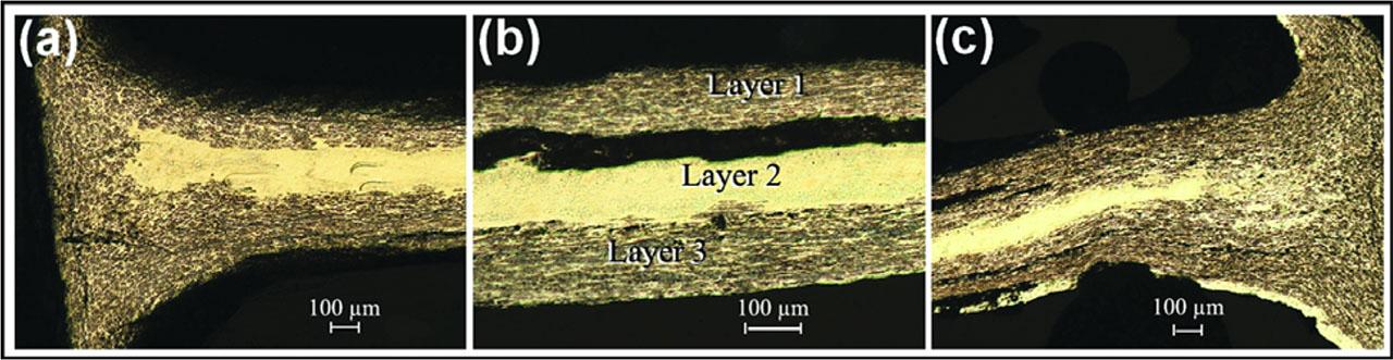 Microscopic photo (magnification: (a) 50×, (b) 100×, and (c) 50×) of coin A (cross-section).