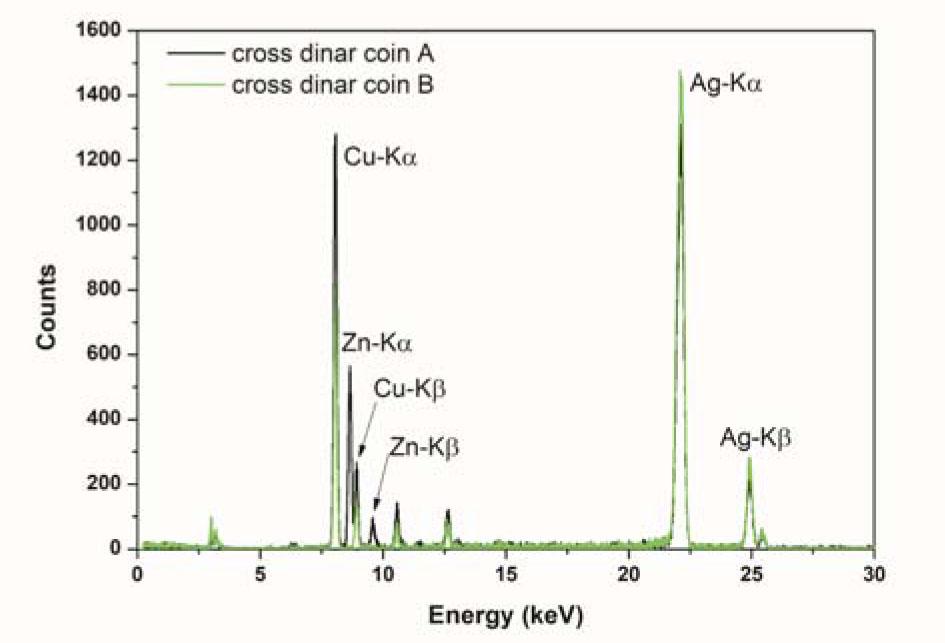 The composition of cross denars was determined using different techniques of X-ray spectrometry. The ED-XRF results refer to the surface measurement. Figure 3 represents the comparison of XRF “macro” spectra for the surfaces of both coins (A and B).
