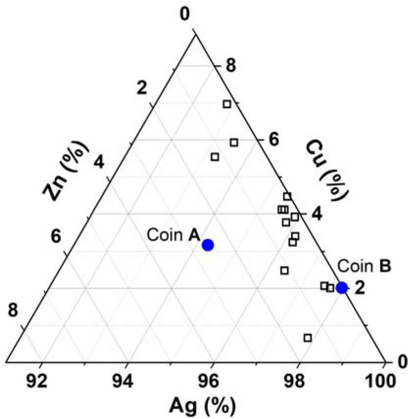 Figure 6 illustrates the elemental composition of the surfaces of two cross denar coins, labeled as coin A and coin B, alongside the measurements from 14 other coins from the same period. These additional coins, represented by open squares, are housed in a museum and could only be analyzed on their surfaces due to preservation concerns. Since these coins could only be analyzed on their surfaces, the data reflect their surface compositions, which are dominated by Ag with minor contributions from Cu and Zn. Coin A and coin B are represented by blue dots. The composition suggests that coin A has a predominantly Ag surface with minor amounts of Cu and Zn. The higher position of coin B toward the Ag vertex compared to coin A signifies an even purer Ag surface with minimal Cu and Zn contents.