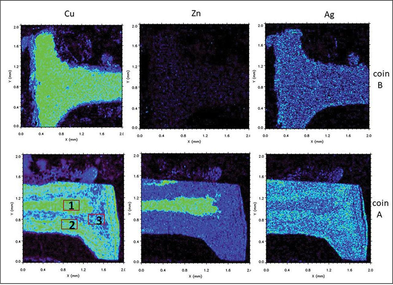 Optical microscopic examinations demonstrated a layered structure and the presence of a core in coin A. Between the core and Ag overlays, there is an empty space (black zone in Fig. 2b) that indicates that these coins were made by hammering (plating) of Ag sheets, forming an overlay onto the central part, that is, core. As there are no traces of exfoliation on the edge of the coins, it can be inferred that the overlays were melted and shaped in this spot, thus forming folded edges. To identify differences in elemental composition due to alloy morphology and measurement technique, macro-ED-XRF (2.1 cm diameter beam) and μ-XRF microanalyses were used. Variables included surface and cross-section examinations.