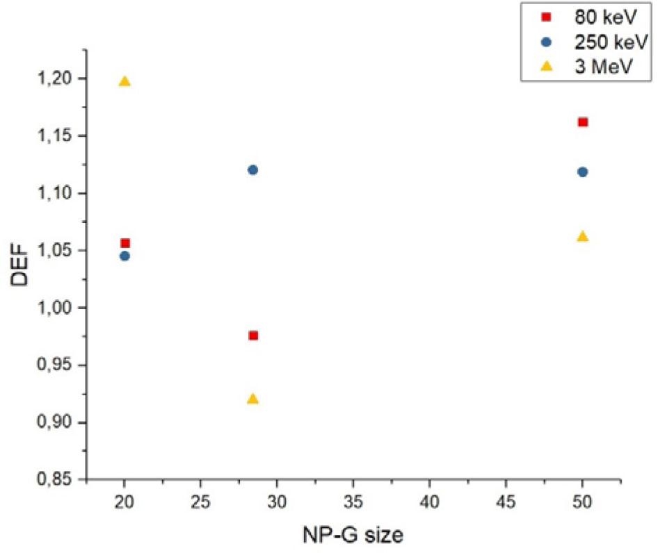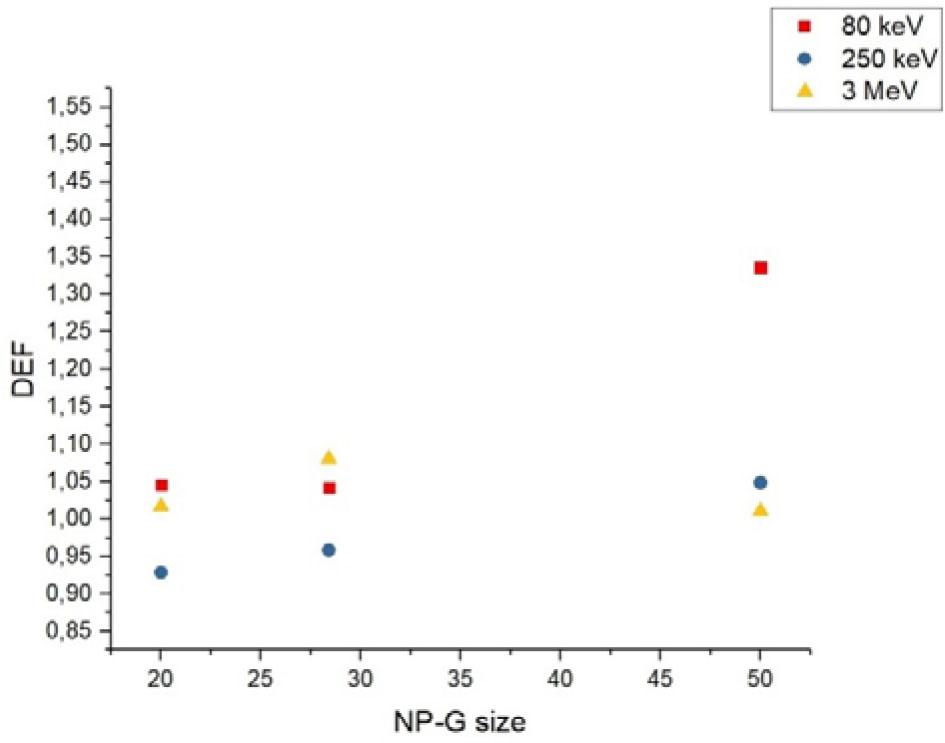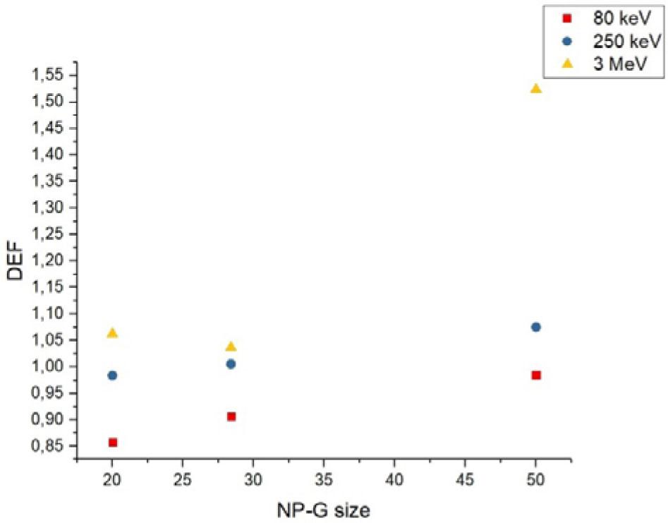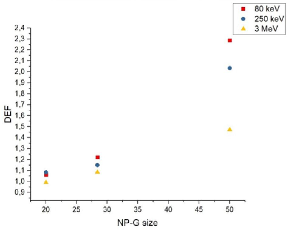 The average DEF values for lateral points were also calculated from the simulation results. At 80 keV photon energy, the average DEF values for 20 nm, 28.4 nm, and 50 nm NPs were 1.0569, 0.9764, and 1.1622, respectively. At 250 keV photon energy, the average DEF values were 1.0453, 1.1205, and 1.1188, respectively. For 3 MeV photon energy, the average DEF values were 1.1969, 0.9199, and 1.0615, respectively. For 50 nm NPs, a decrease in the average DEF at lateral points was observed as the energy increased. For 20 nm NPs, the highest DEF values were measured at MeV energy levels. The lowest average DEF values at lateral points were observed for 28.4 nm NPs at MeV photon energy. The average DEF values obtained at lateral measurement points are shown in Fig. 5.