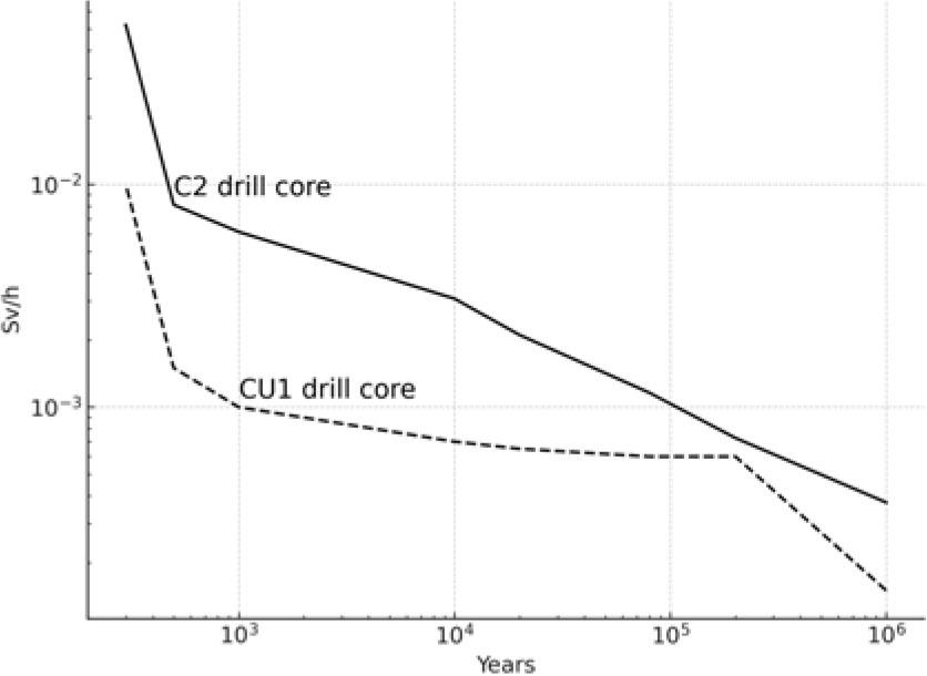 ![Radiological dose rate, in Sv/h, 40 cm from two French HLW drill cores. The C2 drill core is VHLW; the CU1 drill core is SF (p. 533 in Ref. [5]).](https://sciendo-parsed.s3.eu-central-1.amazonaws.com/68a8bde5afc50a4de0964f13/j_nuka-2025-0009_fig_004.jpg?X-Amz-Algorithm=AWS4-HMAC-SHA256&X-Amz-Content-Sha256=UNSIGNED-PAYLOAD&X-Amz-Credential=ASIA6AP2G7AKL7IWZU34%2F20260113%2Feu-central-1%2Fs3%2Faws4_request&X-Amz-Date=20260113T020502Z&X-Amz-Expires=3600&X-Amz-Security-Token=IQoJb3JpZ2luX2VjEC8aDGV1LWNlbnRyYWwtMSJGMEQCIBemo2RDz6JQyP5ax7S4n3JssOwrmcV56ms4Gio6Jb7wAiAQmviEWOEzFmbIStQp6wAZhoPdykJDbgqJFF3fwSzktSrFBQj4%2F%2F%2F%2F%2F%2F%2F%2F%2F%2F8BEAIaDDk2MzEzNDI4OTk0MCIMBMOTAGNK1cjuT8KMKpkFiFBk11mXU9LcbYtVt8ipmxd%2FobrZEDCf1EFuRId2YrsQrv8BESATmNIaxR5Eoha5L8bPyOhpAVNPKRTkFGzpNHIrWmeMQC5qu%2BPBNy%2FEy9EslC24PfbY%2FdKQz8MxroD2uQqGhtBonh%2BnLvci5NSURzuq7zG4ow3%2ByMtCE9GVw%2FJM20LfZxb6qotHiVLAvp7cjx1rqR%2FAOF7FpZObgF5z2vVeSIBSbwmUPdVk7KknxBSGAPUCWCOOhka0EwtqTD1Jz4SLjMcf%2Bu3deX%2Ft6Cu%2B4TDb3lyqaNRoupT8BkIX%2FIc8ikZ6opDRzjmcCEv89asWmUVIVWlV991RWJqI9LSO8lrOsaXi%2FShaUWUFpgWPtUtvb8lVXGt6ePGkQMQiiWY9hRkzpn9tD1lAOE6%2B%2BOhCO7%2FEslqspJ8ommnsGmdzm2gfzKcxLQUOAviv7gWjrp6avAPMEAx5GArhFnSzTXYfDoBBN1%2Bu906O14QHxmyji%2FKlNVubcpsyTRG81Vo0kURt2nxu7%2FZ3XoLFUgEGQeQDYDOCreU%2B6H0RrWXgzt8f%2FwGADVzL8bP7fhVeBFKittLNEDUGNAMrV3fUsq1Y%2BPf0JHh%2BkEA2OCFR%2BuEsLGL0JXjH9shYseA%2BiOs%2BFc4xvKjb%2BHlctfHzfwjQVKoYrZg2Nf0zSmJ0sQVe888D1YJbFG6mBoHQHCas93HtpTgYAeRz8TcNJvNlqWAI4U4e8gwdC64Xd8x7Ncyij1QpGV%2FXMKrCXP6MH%2FSqec1hyImjHEbiAypKYld%2FsByvRq4Kqos1GS3%2FbOoAf1Glt91dAkAYlI4rSOdva9kdngGtS7fjRjpKYf3jypw%2FujjwQ1lbnXBjYLJ3497FDdkiJBNef3V2m4TlpEWZldUew%2Bgw5PmVywY6sgExAzY4UvmZd%2FcqRhwjcR6WoCEvgcP2gor7oxrBshN9zBnZ4%2FZGnbUOB4ub8%2FYNm99S5rMGoVKVS0MoXiPf8X0Rcc0NlyyX37x%2FVPtNjHokaG9w4k0gA1S2jfAMtDJ%2FEEHXlSsuNf3x5HFWAgs9eSnW5x0HxJlJfNhp2Y10ZtWdxV5ASo%2BSqa0lSaH%2FbBLLZHwK%2BGXa8HJOUj%2FwQ%2BrvMaXml%2B1rATRWBaRZhDn9PtiFjIYo&X-Amz-Signature=fe5c3f911187a75f384ff512631eddb5d76a9a5372c98b6ca012224cf1a81703&X-Amz-SignedHeaders=host&x-amz-checksum-mode=ENABLED&x-id=GetObject)
