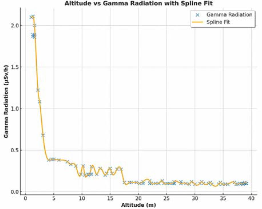 Since gamma radiation intensity diminishes with distance from the source, altitude plays a significant role in the recorded values. We analyzed the vertical profile data to quantify this relationship. The results (Fig. 1) demonstrate a clear inverse correlation between altitude and gamma radiation levels, consistent with the inverse-square law governing radiation attenuation [6].