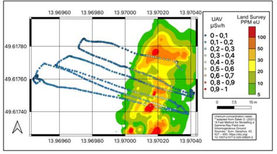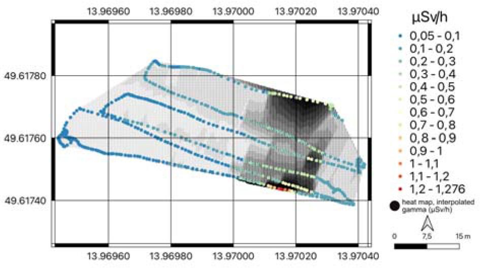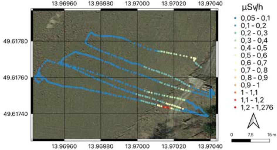 UAV gamma radiation data collected via the GammaRAE II R dosimeter were plotted over aerial image to visualize the radioactivity distribution (Fig. 2). The uneven distribution of the measured points is given by manual flightpath without pre-programmed waypoints.