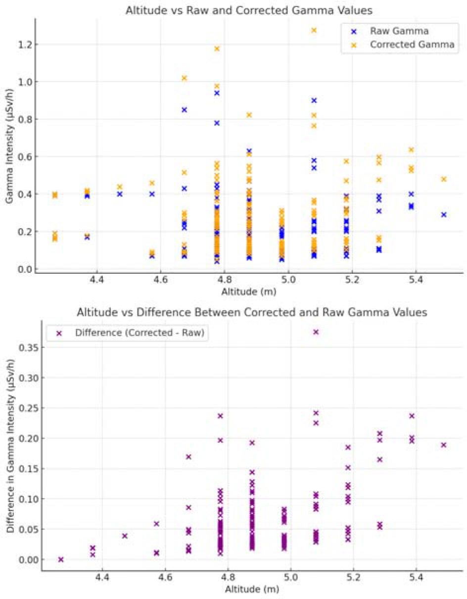 Each point represents a measurement, with color indicating the intensity of the measured gamma radiation (μSv/h). The plotted gamma radiation measurements were corrected for altitude error (Fig. 3) using the inverse-square law, which governs the attenuation of radiation with distance from the source. Since gamma radiation intensity diminishes with the square of the distance, a correction factor was applied to each recorded value. It is calculated using the following formula: