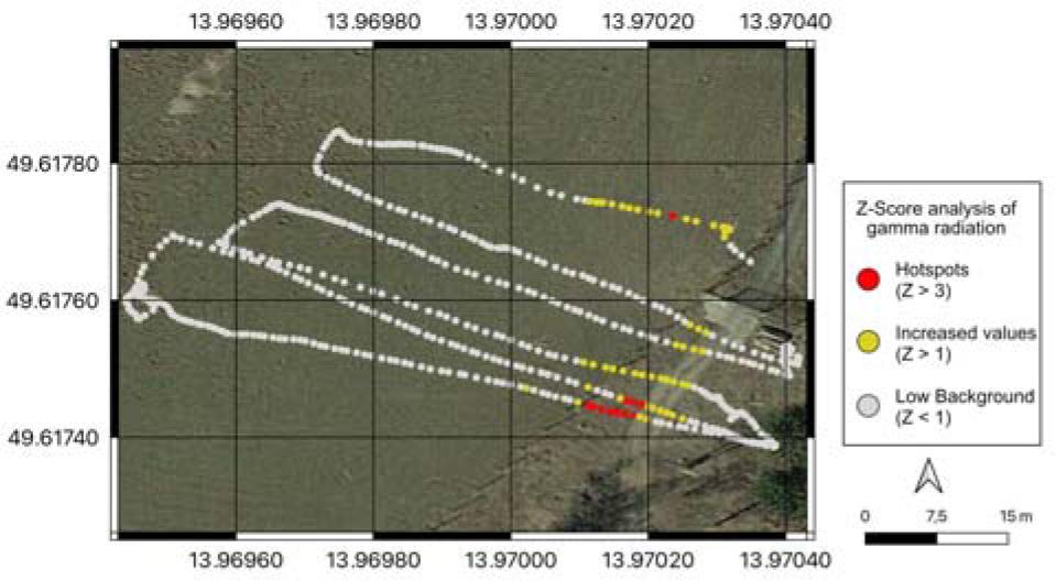 To identify areas of elevated gamma radiation, we conducted a Z-score analysis on the collected data (Fig. 5). Z-scores quantify how many standard deviations a particular data point is from the mean, offering a method to assess the anomaly of radiation levels relative to the overall dataset [11, 12]. It is calculated using following formula: