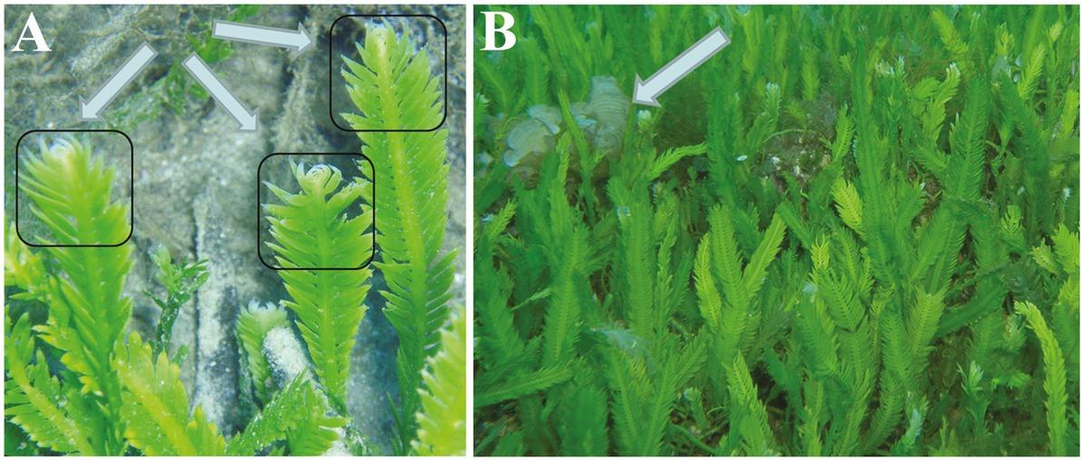 A) Caulerpa taxifolia, the Bay of Stari Grad, the Island of Hvar, 2 cm long cut-off upper part (photo by Tonči Dulčić). B) Padina sp. (arrow) in a dense patch of Caulerpa taxifolia, the Bay of Stari Grad, the Island of Hvar (photo by Tonči Dulčić)