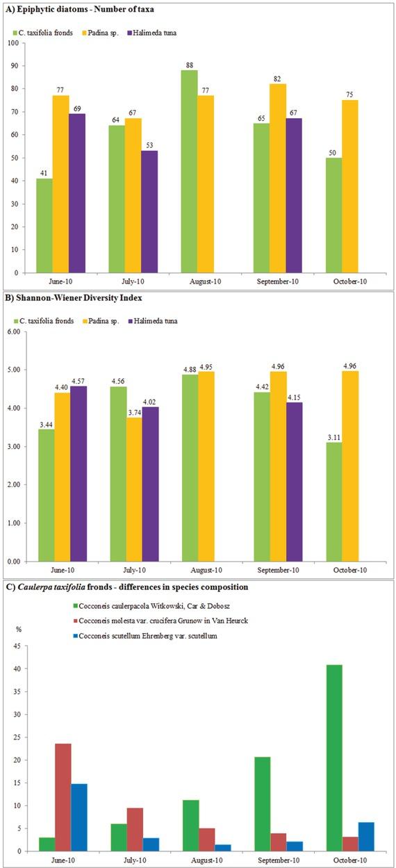 The results of the presented study clearly showed differences in the diatom species distribution pattern between the selected autochthonous macroalgae and invasive C. taxifolia. This may be explained, at least partly, by varying thallus architecture of the studied species, given that Padina sp. and H. tuna have calcified thalli. In addition, multiple environmental factors reflecting the seasonal and site-specific conditions could also be manifested in the structure and species composition of algal communities. For this reason, the results of the present study imply only that an epiphytic diatom community is affected by macroalgae, especially those containing toxins. The lack of samples of younger parts cut from indigenous algae does not allow us to draw definite conclusions about succession and seasonal specificity or distribution of epiphytic diatoms on macroalgal hosts. It can be assumed that differences between invasive and autochthonous algae would also be noticeable at an early stage of life and exposure of macroalgae to benthic diatoms. Obviously, in order to increase the accuracy of predictions, further long-term studies of dynamics of epiphytic diatoms on different macroalgae and other substrates, as well as effects of various environmental factors on the growth of epiphytic diatoms are necessary.